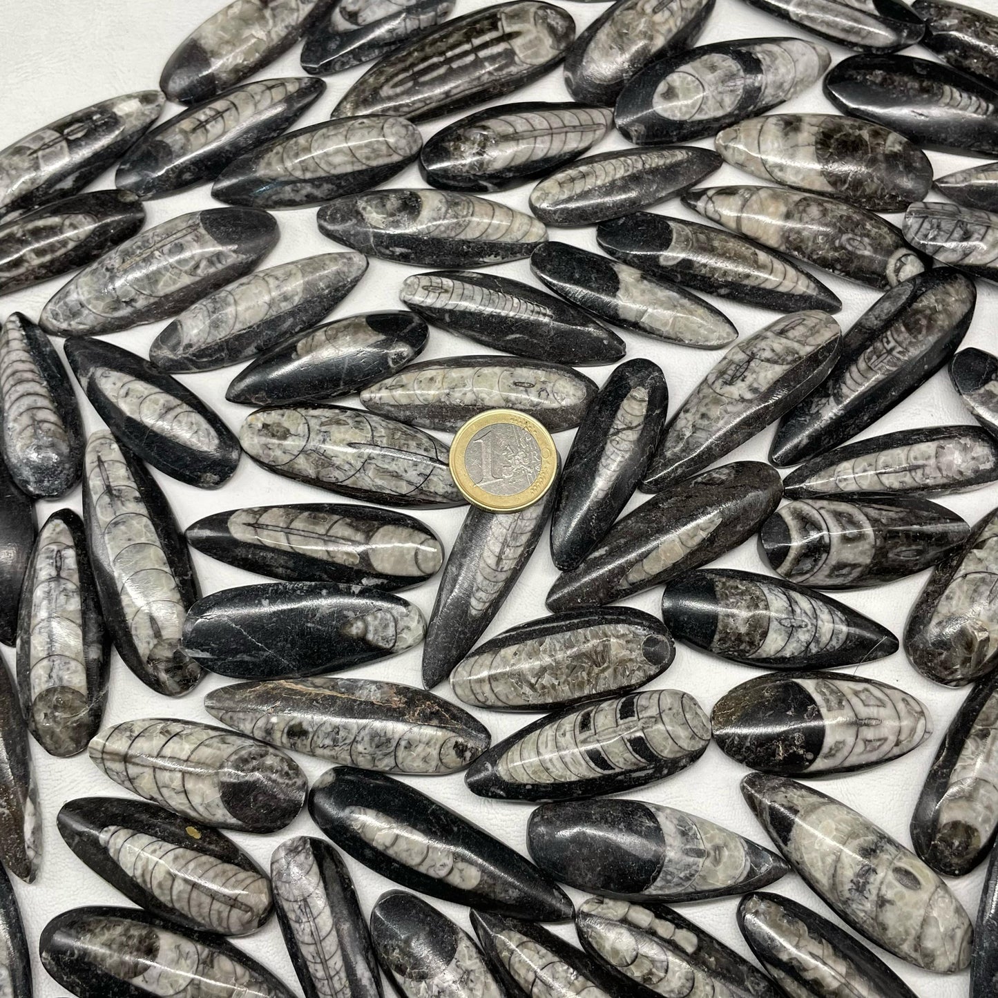 Experience the natural beauty of Moroccan black Orthoceras fossils with this polished gemstone. The unique black and white patterns will add a touch of elegance to any setting. Display it on your desk or use it as a paperweight, and enjoy the rich history and intrigue of this timeless gemstone.